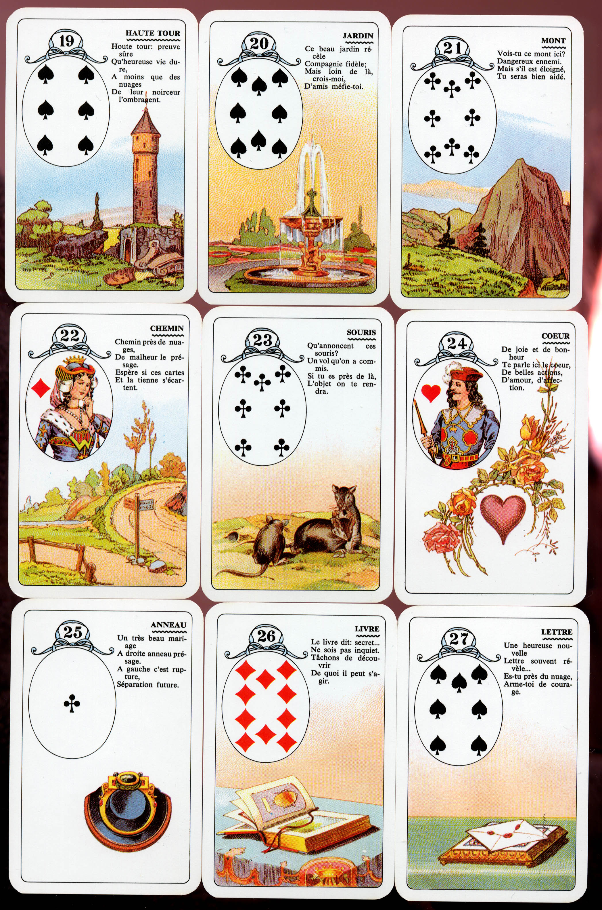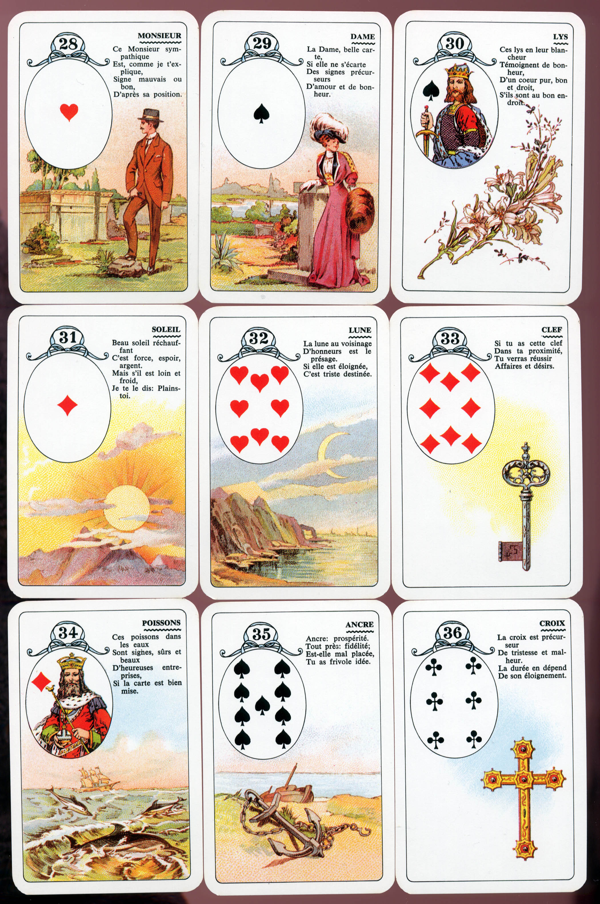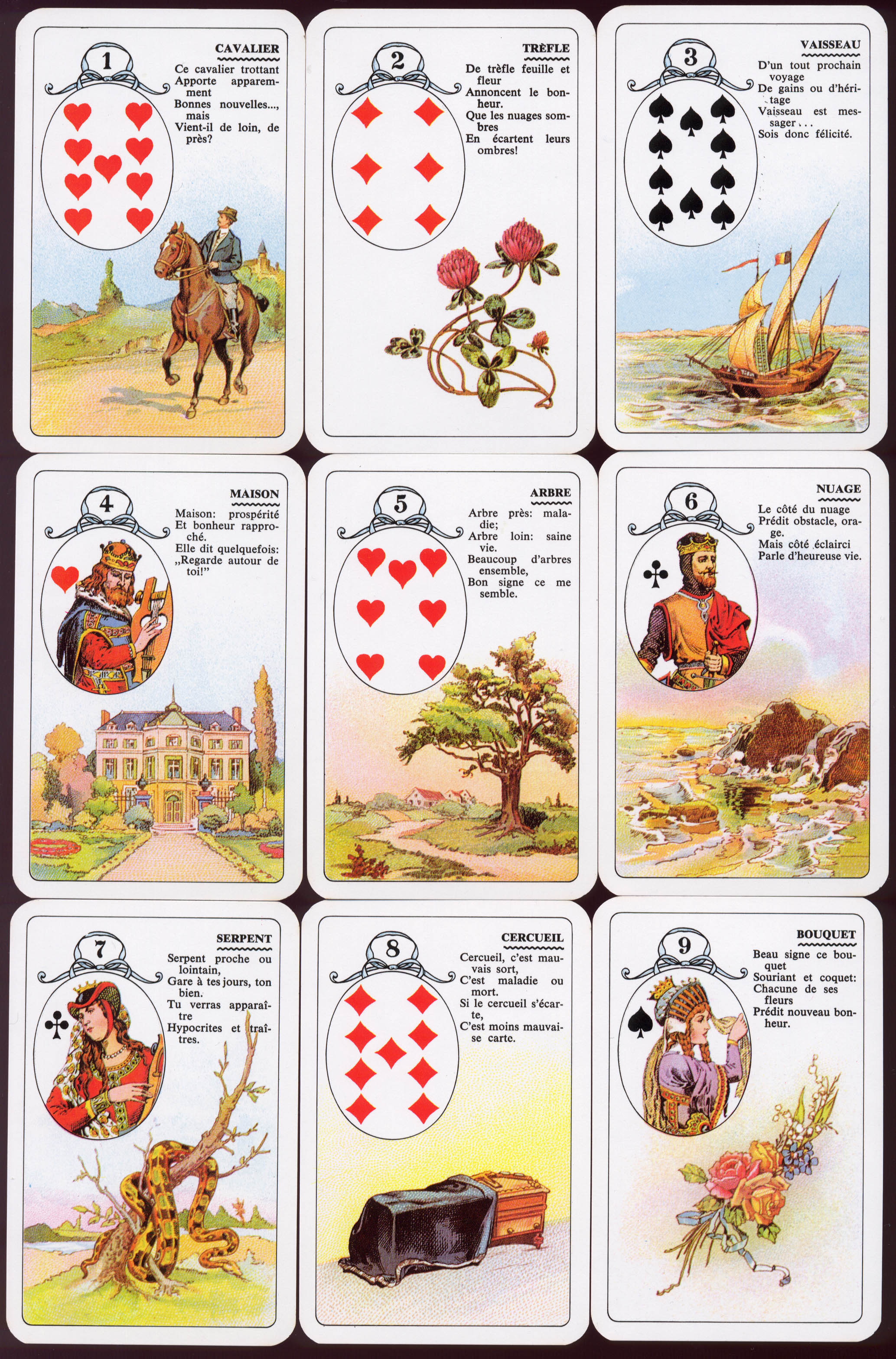 Voici l’annonce d’une joyeuse entrée dans une grande et joyeuse société où vous tenez énormément d’être admis. Si cette carte est près de vous, elle vous promet d’y trouver une amitié réelle et durable. Si elle est loin, elle décèle la présence de faux amis et vous dit de les éviter.